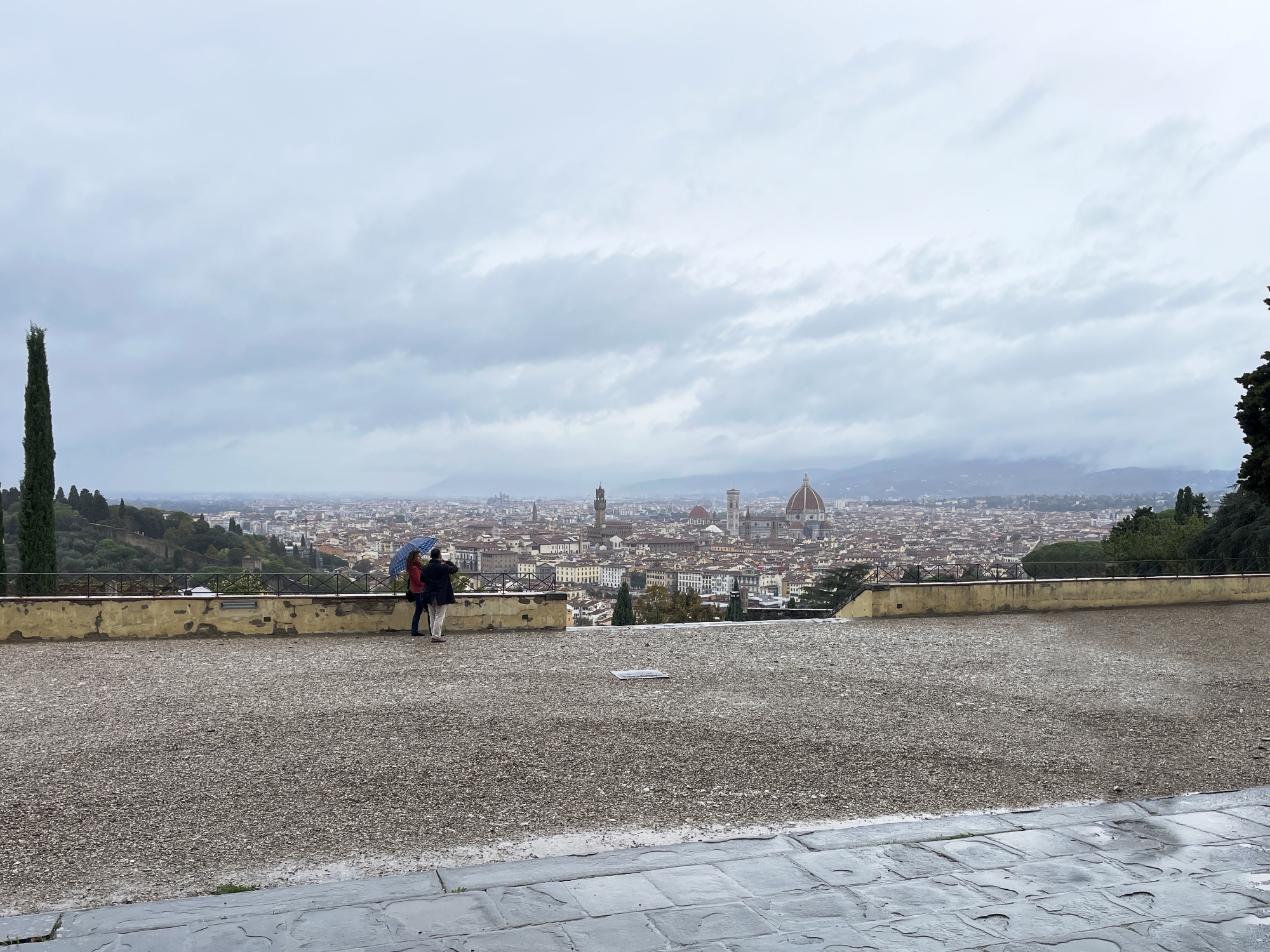 Vom Kirchplatz aus genießen wir einen ersten, faszinierenden Blick auf die Stadt, einen Vorgeschmack auf die Kulisse, die sich uns bietet, sobald wir den Piazzale Michelangelo erreichen, den berühmtesten Aussichtspunkt auf die Stadt Florenz.