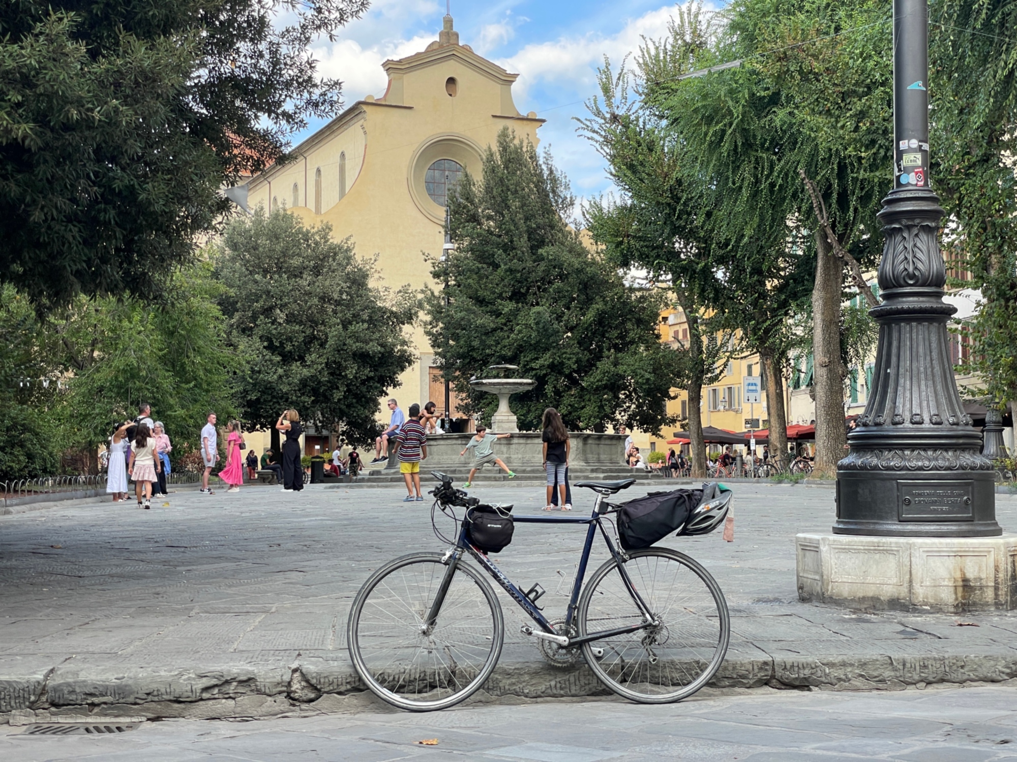 Wir starten auf der Piazza Santa Maria Novella, nur einen Steinwurf vom Bahnhof entfernt, vor der prächtigen Basilika, die 1242 von den Dominikanern gegründet wurde. Einmal im Sattel biegen wir in die Via dei Fossi ab, die sich im Vergleich zur Kirche auf der gegenüberliegenden Seite des Platzes befindet.