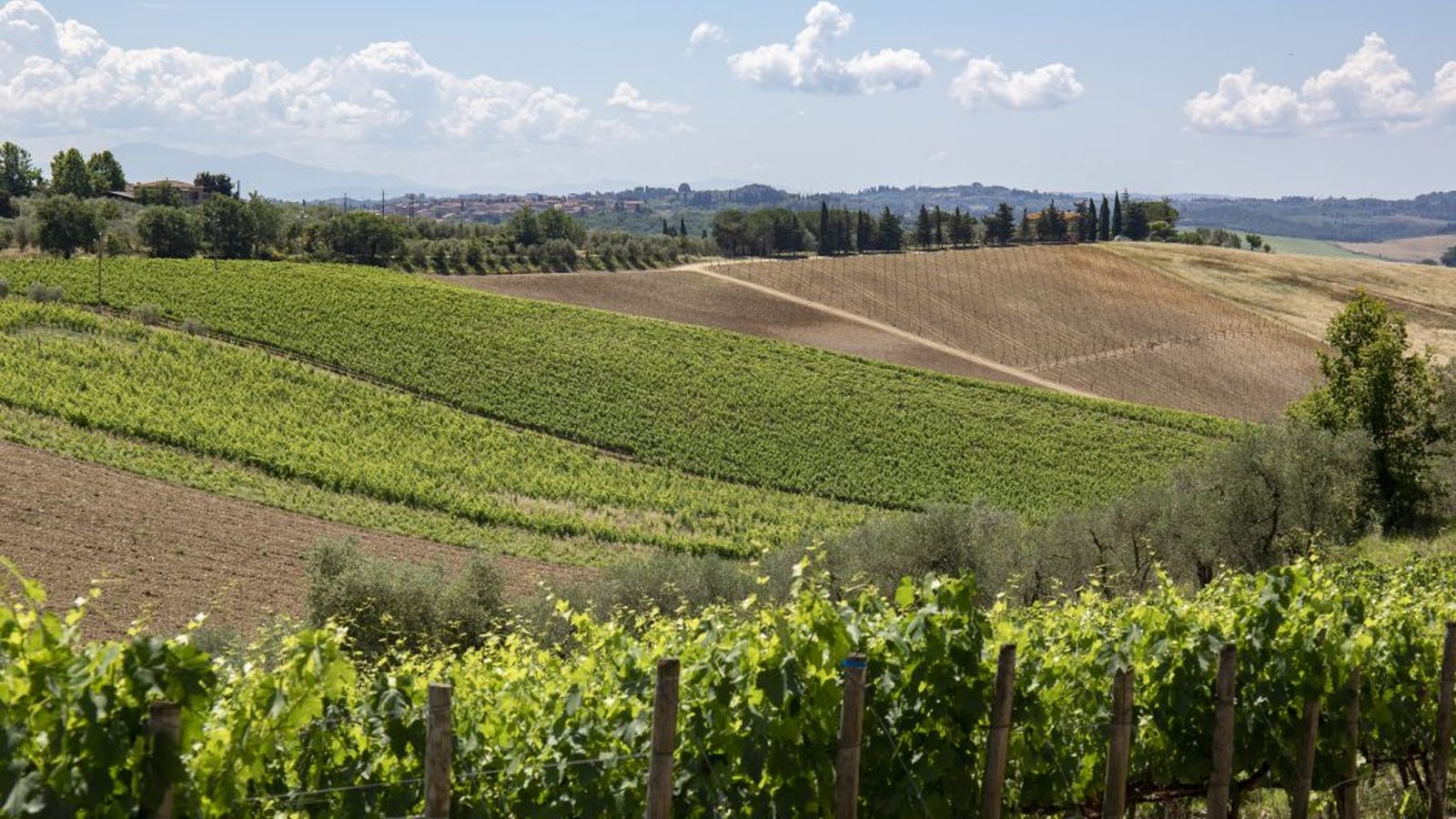 Zurück auf dem Asphalt biegen wir links ab und dann gleich wieder rechts in Richtung Pievasciata. Wir befinden uns auf einer schönen Straße, die auf großer Höhe bleibt und uns einen Panoramablick auf Siena und die ersten Hügel des Chianti bietet. Hier wechseln sich Anbauflächen mit Waldgebieten ab und verleihen der umgebenden Landschaft die typischen Merkmale dieser Heimat des Weins und des Öls.