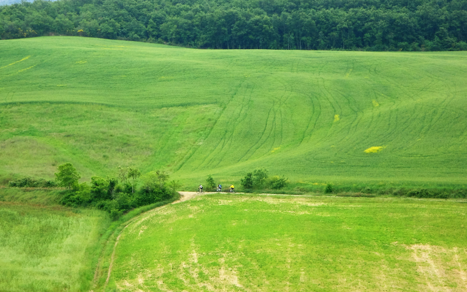 Laissez vos vélos rouler à toute vitesse pendant les 8 premiers kilomètres de descente de la route provinciale de Voltina (SP 17), puis prêtez attention pendant la section descendante de la route SP 114 Poggi del Sasso, une route à très faible trafic que vous suivrez jusqu'au petit hameau agricole de Pian Taverna. Lorsque le fleuve Ombrone coule désormais sur votre gauche, cela veut dire que vous avez atteint une altitude de 40 m a.s.l, c’est-à-dire le point le plus bas de votre itinéraire. Après avoir traversé le pont sur un petit ruisseau, suivez à nouveau la route SP 114, qui commence à monter graduellement. Cette longue et pittoresque partie ascendante grimpe tout au long du versant ouest du Mont Cucco, avec des pics atteignant des pentes de presque 15 %, jusqu'au sommet situé à 289 mètres au-dessus du niveau de la mer. Le tronçon suivant, qui mène au village de Poggi del Sasso, vous offrira des vues imprenables et marque également une ligne de partage des eaux d’un point de vue paysager et territorial : à gauche, la vallée de l'Ombrone s'ouvre sur la campagne dominée par la colline sur laquelle le village médiéval de Campagnatico s’impose. À droite, il y a une succession de « poggi » (collines) parsemées de vignobles sur lesquelles domine le puissant château de Colle Massari, avec un horizon qui s'étend jusqu'aux hêtraies du Mont Amiata.