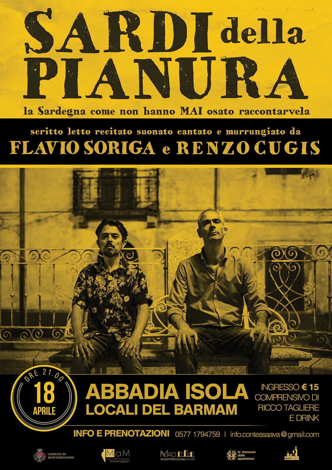 In programma lo spettacolo di stand up Sardi della Pianura, interpretato da Flavio Soriga e Renzo Cugis. La performance, della durata di circa 60-75 minuti, unisce letteratura, musica e satira per offrire un racconto ironico e originale della Sardegna, lontano dai luoghi comuni, tra narrazioni contemporanee e suggestioni musicali.