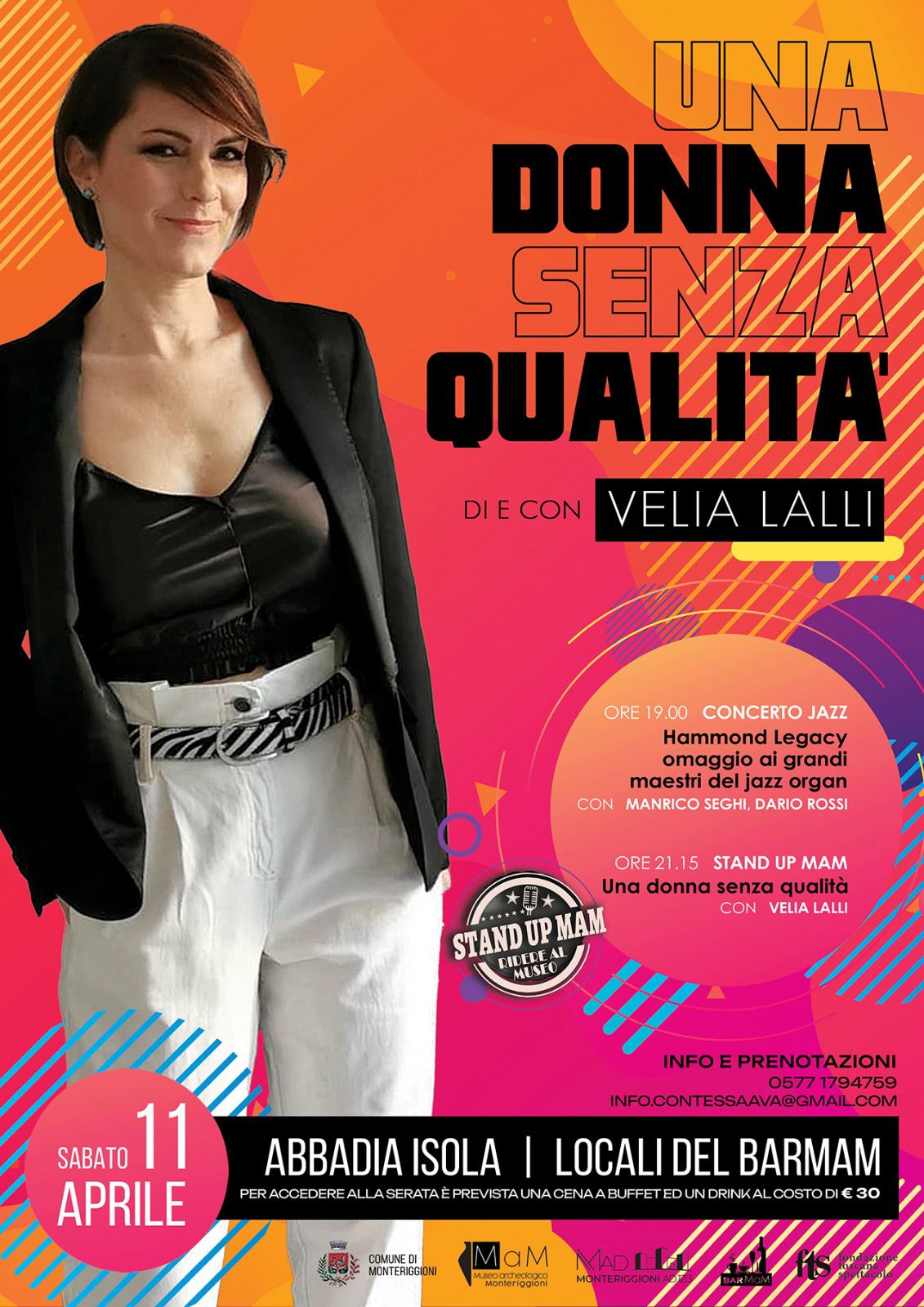 Sabato 11 aprile viene proposto un doppio appuntamento che unisce il suono dell’organo Hammond alla comicità tagliente di Velia Lalli.