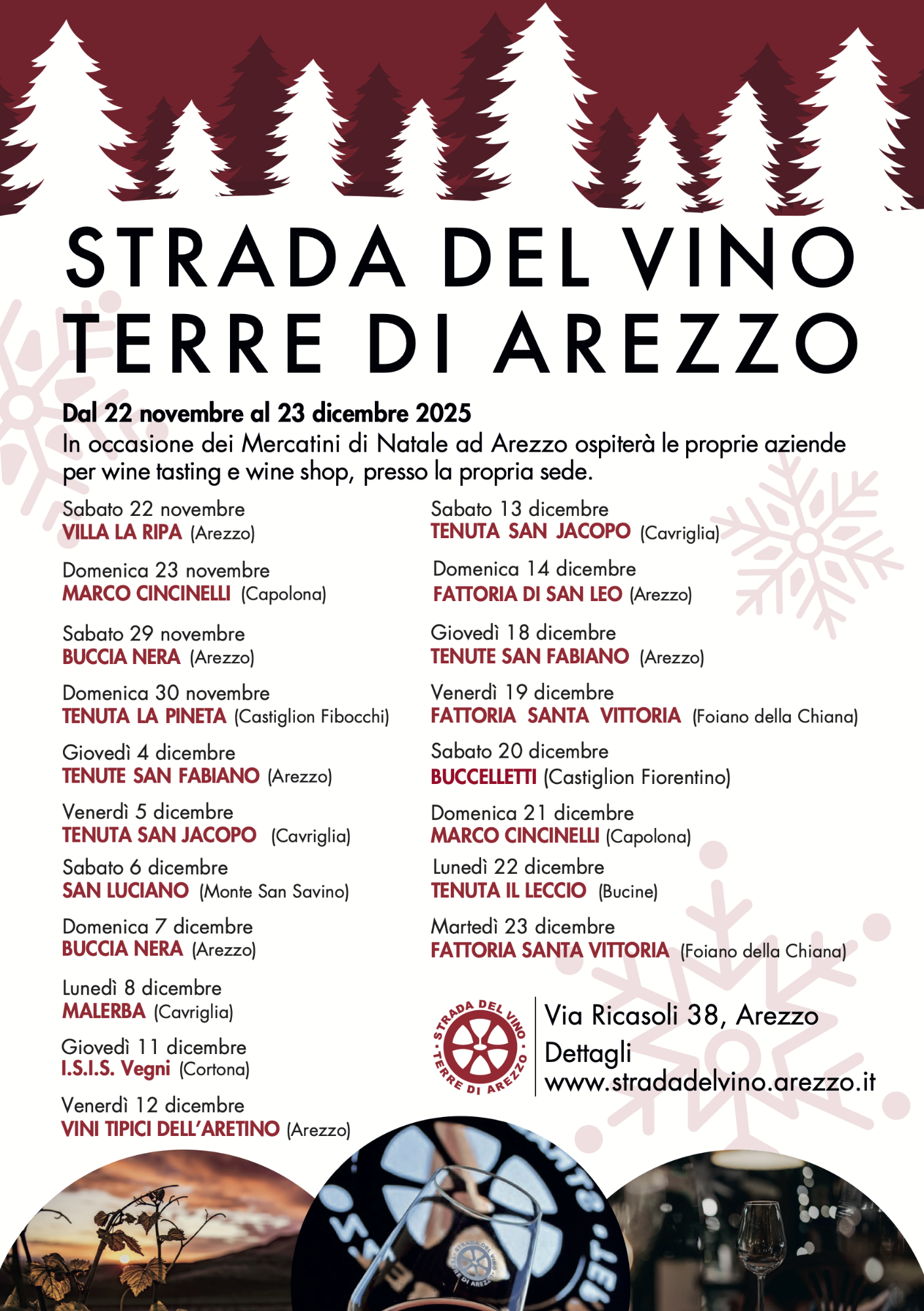 Fino al 23 dicembre, presso la sede dell’associazione (Via Ricasoli 38), nel cuore della manifestazione, le cantine aderenti accoglieranno visitatori, appassionati di vino, famiglie e turisti curiosi, per far conoscere i profumi, i sapori e le storie che rendono unici i vini aretini.