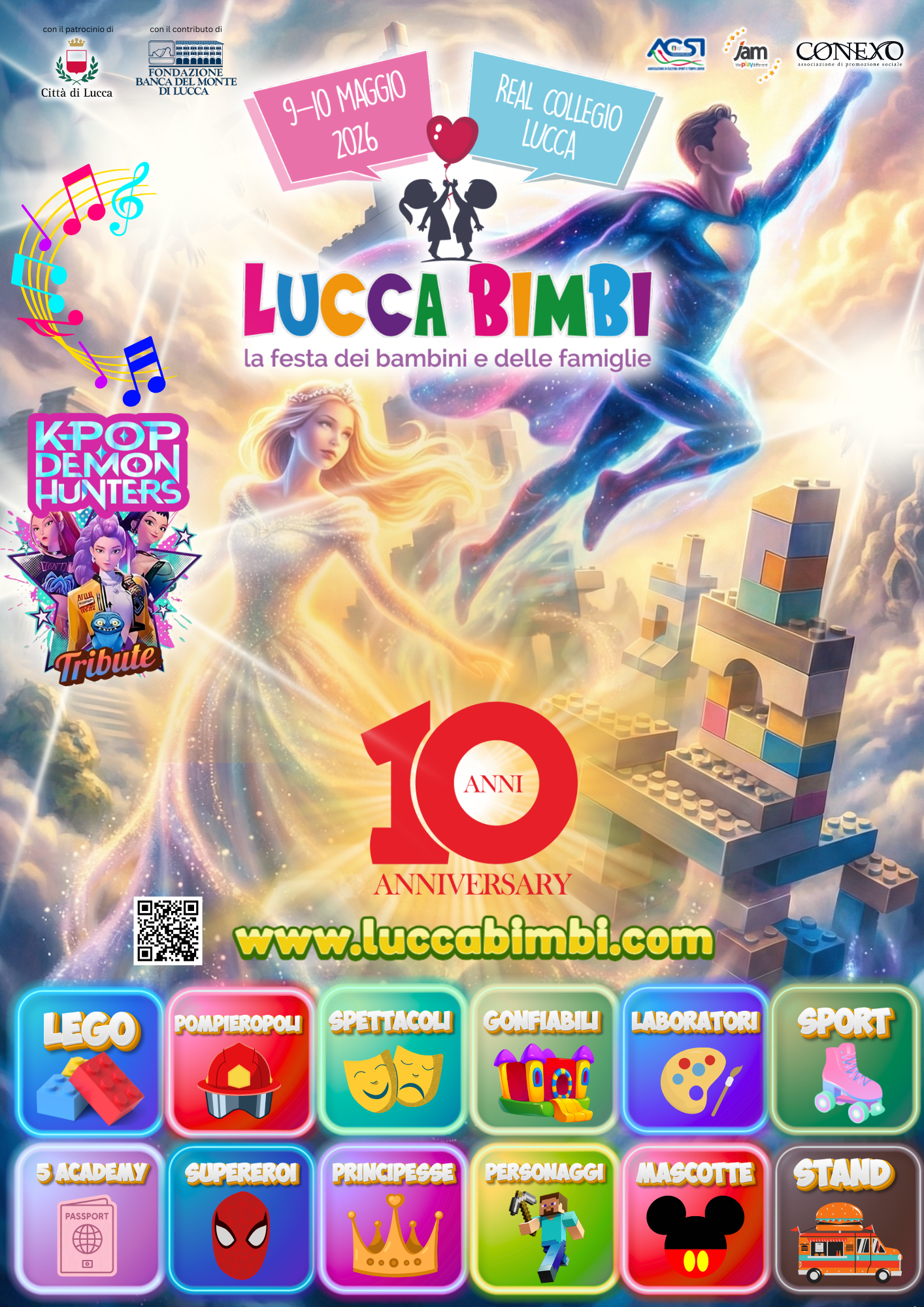 Torna a Lucca l'evento più atteso dalle famiglie: sabato 9 e domenica 10 Maggio, le prestigiose sale storiche e i chiostri del Real Collegio di Lucca si trasformeranno in un immenso parco divertimenti al coperto per celebrare i 10 anni di Lucca Bimbi.
