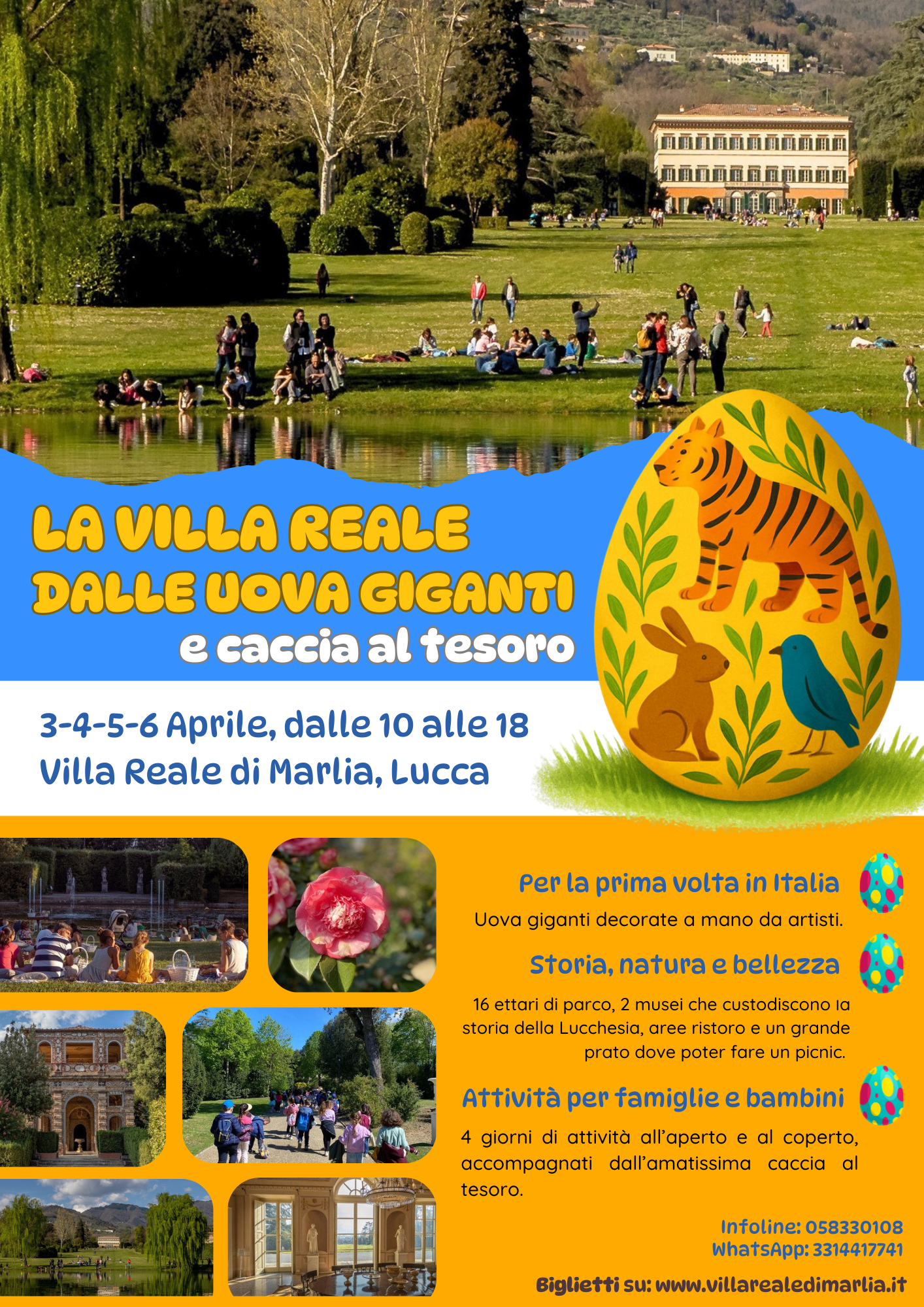 Dal 3 al 6 aprile, appena fuori Lucca, la Villa Reale di Marlia ospita La Villa Reale dalle Uova Giganti, l’evento di Pasqua dedicato alle famiglie che amplia a quattro giornate la storica caccia al tesoro di Pasquetta e anima i giardini con grandi uova decorate e attività per bambini.