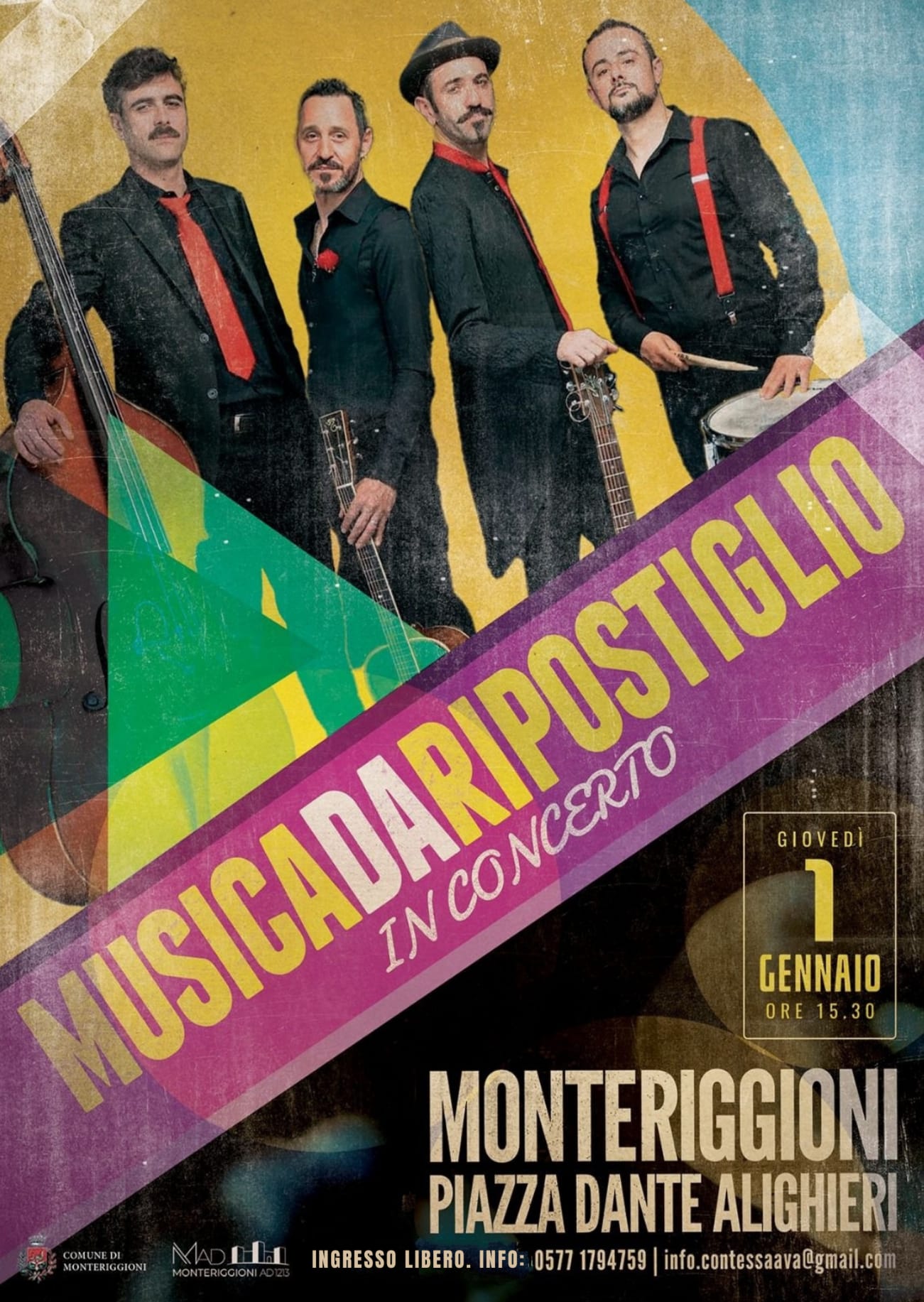 Il 1 gennaio alle ore 15.30 al Castello di Monteriggioni, in Piazza Roma, si terrà il concerto gratuito dei Musica da Ripostiglio, un quartetto pop-swing toscano noto per il mix di virtuosismo, teatro comico e stile vintage.
