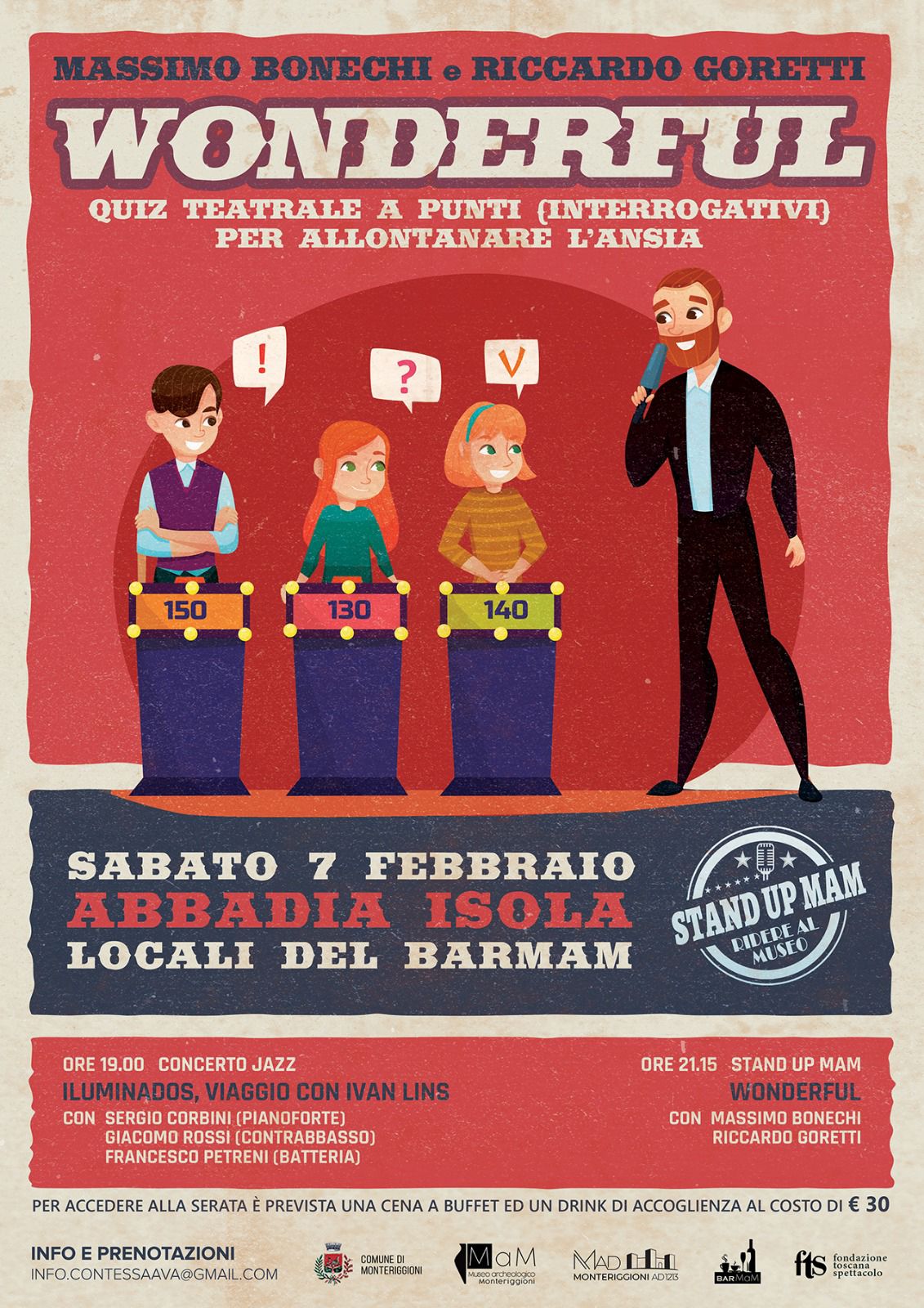 Dalle 21:15 spazio alla stand up comedy con Wonderful, esilarante quiz teatrale scritto e interpretato da Massimo Bonechi e Riccardo Goretti.