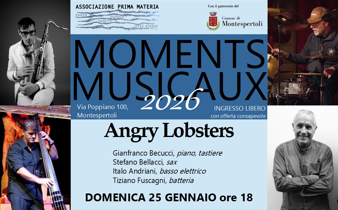 Domenica 25 gennaio alle ore 18, negli spazi di Prima Materia - Montespertoli - si terrà il primo concerto della rassegna Moments Musicaux - Inverno 2026, con protagonista il gruppo Angry Lobsters.