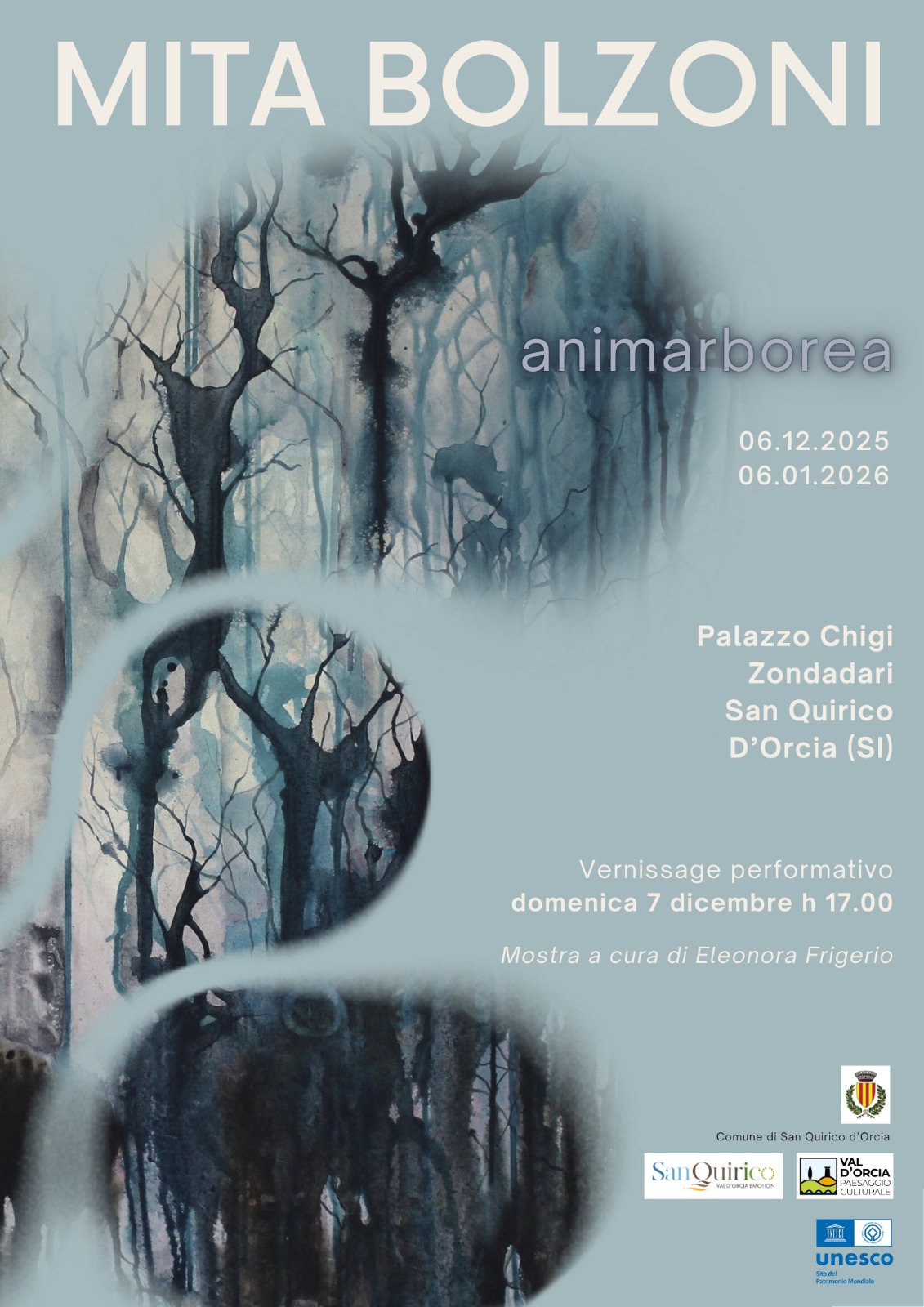 Dal 6 dicembre 2025 al 6 gennaio 2026, le sale storiche di Palazzo Chigi Zondadari a San Quirico d’Orcia ospitano Animarborea – Dalla parte degli alberi, mostra personale di Mita Bolzoni, a cura di Eleonora Frigerio, docente e storica dell’arte.