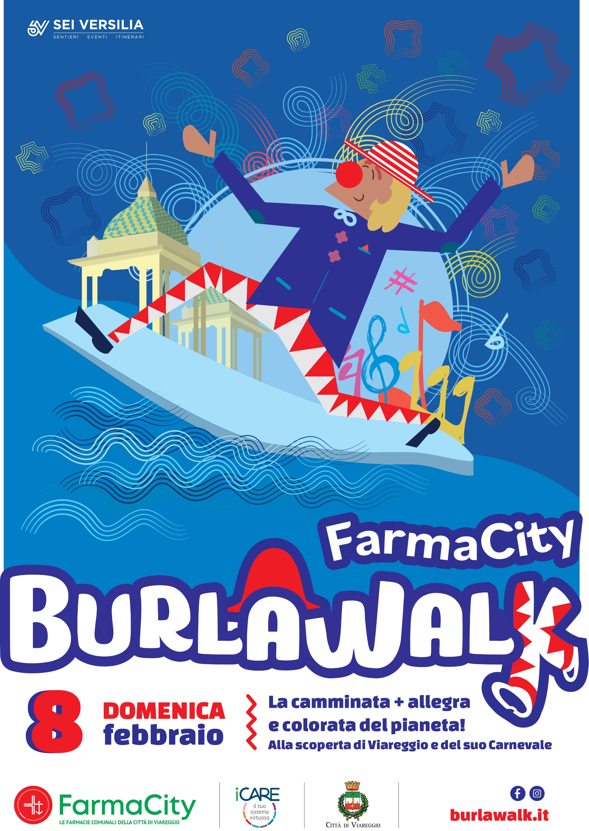 Domenica 8 febbraio 2026, nella cornice della Passeggiata di Viareggio, torna FarmaCity BurlaWalk, una camminata in maschera - giunta alla terza edizione - aperta a grandi e piccoli che celebra lo spirito del Carnevale. Il percorso, lungo circa 5 chilometri, si snoderà da Piazza Mazzini alla Darsena, attraversando l’area del Mercato e la Pineta di Ponente, per poi fare ritorno in piazza.