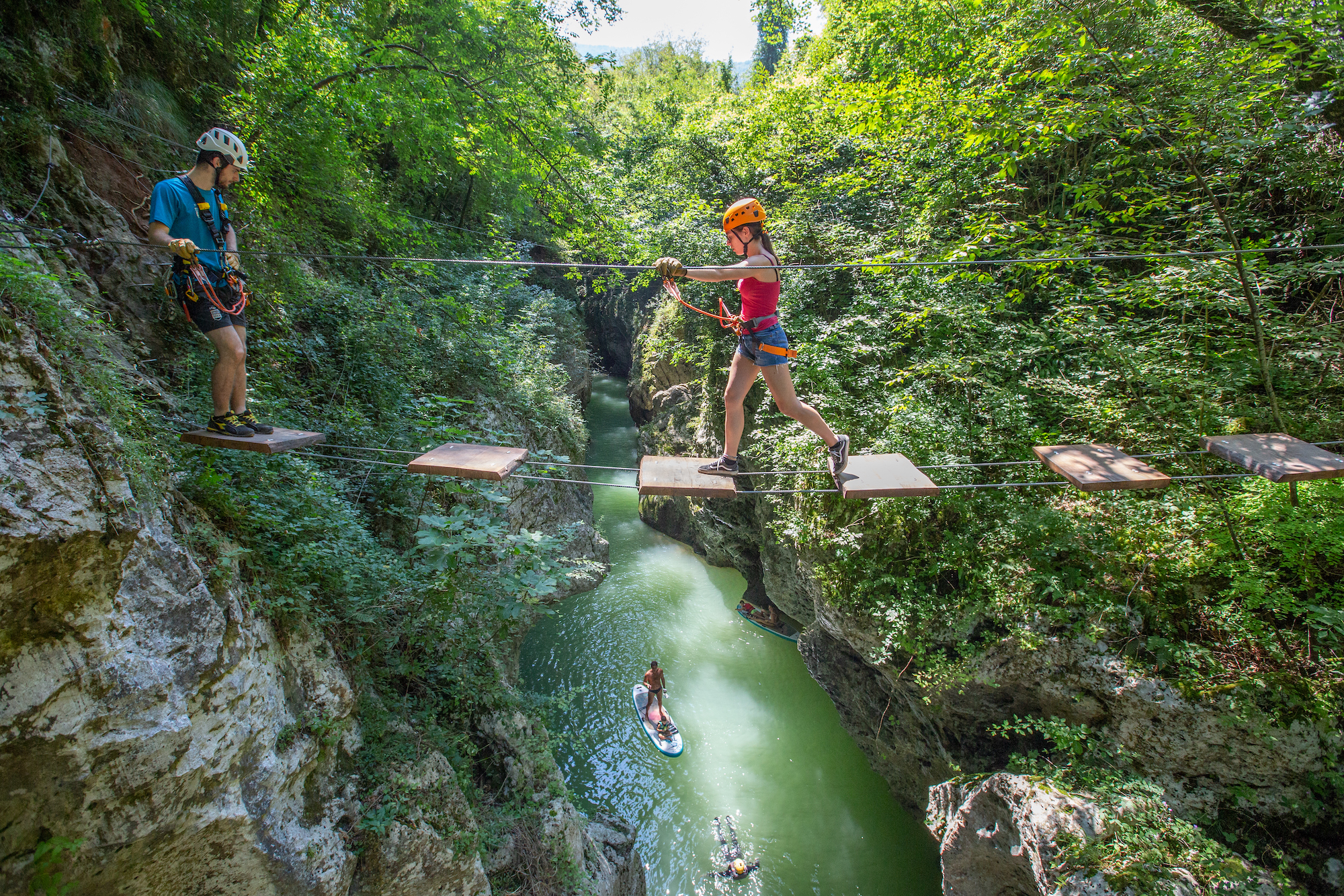 Un percorso composto da teleferiche lunghe anche più di 100 metri che attraversano il canyon sopra un fiume verde smeraldo. Ponti tibetani, slackline e passaggi mozzafiato permettono di sfrecciare tra le rocce a picco.