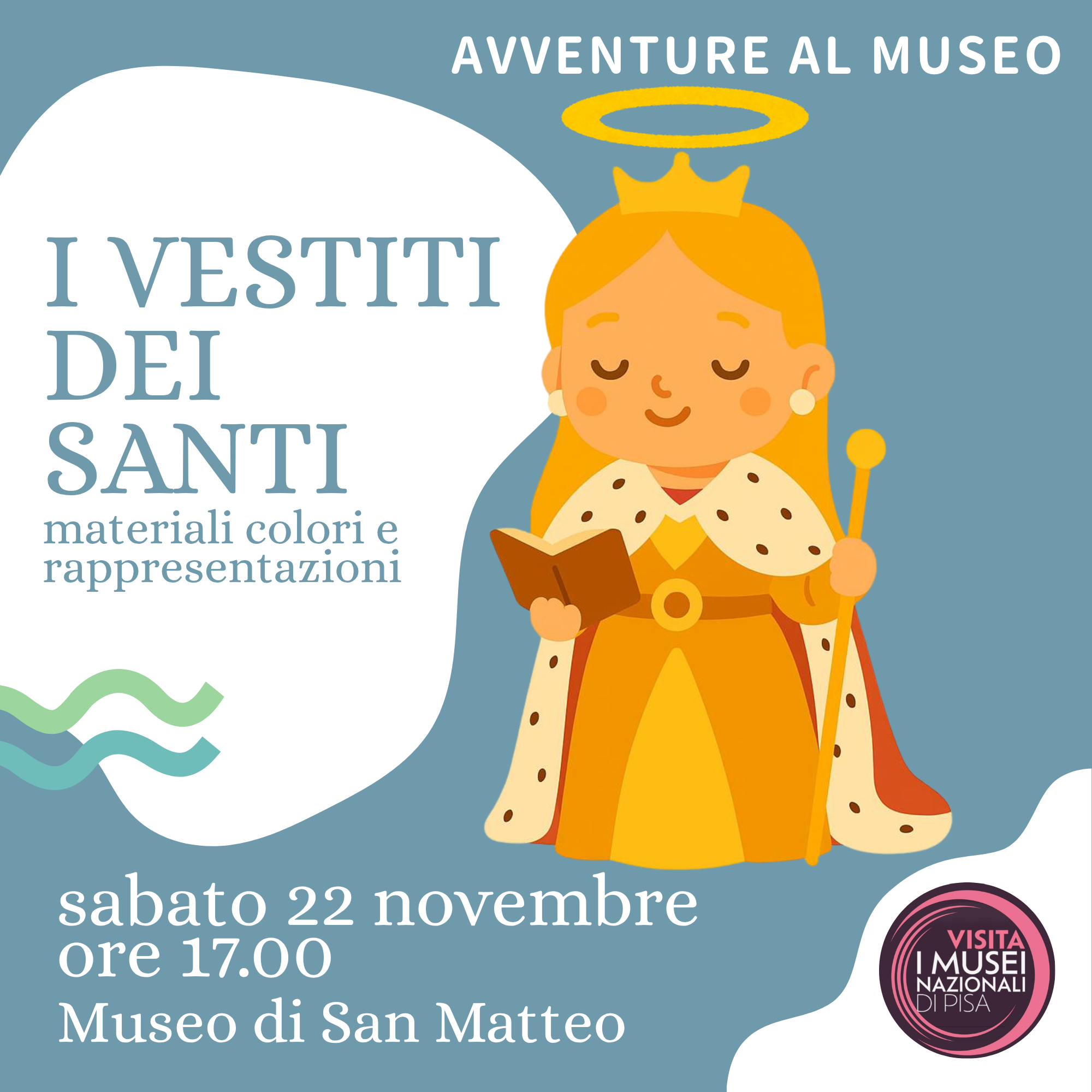 Cosa raccontano gli abiti dei santi? Colori, tessuti e decorazioni non sono solo belli da guardare: parlano di storie, virtù e simboli nascosti! Al Museo Nazionale di San Matteo, i bambini diventeranno piccoli osservatori d’arte, toccheranno stoffe, scopriranno i segreti dei vestiti dipinti e disegneranno il loro santo preferito… con fantasia e colore! Un viaggio tra arte e creatività per bambini dai 6 agli 11 anni.