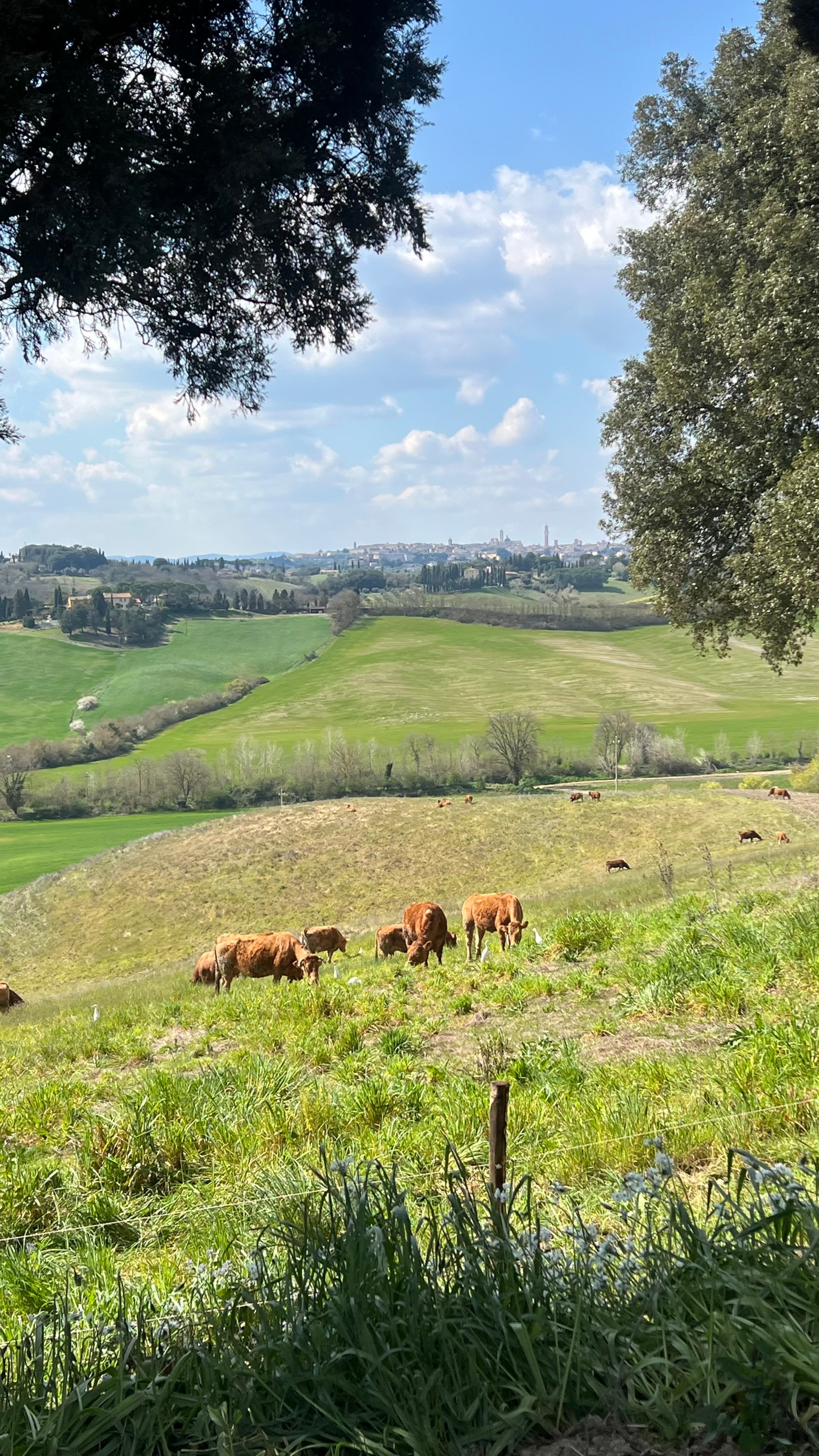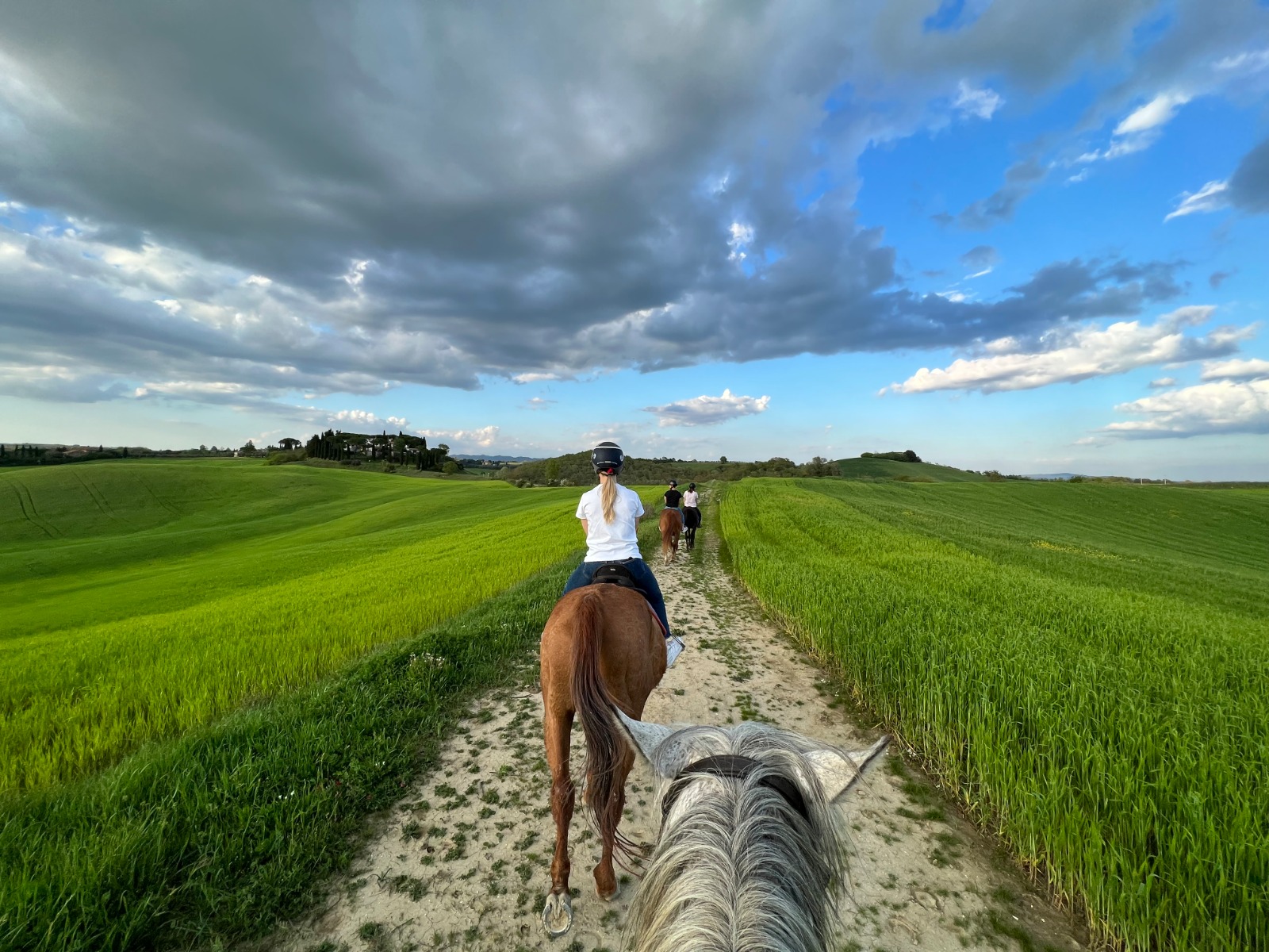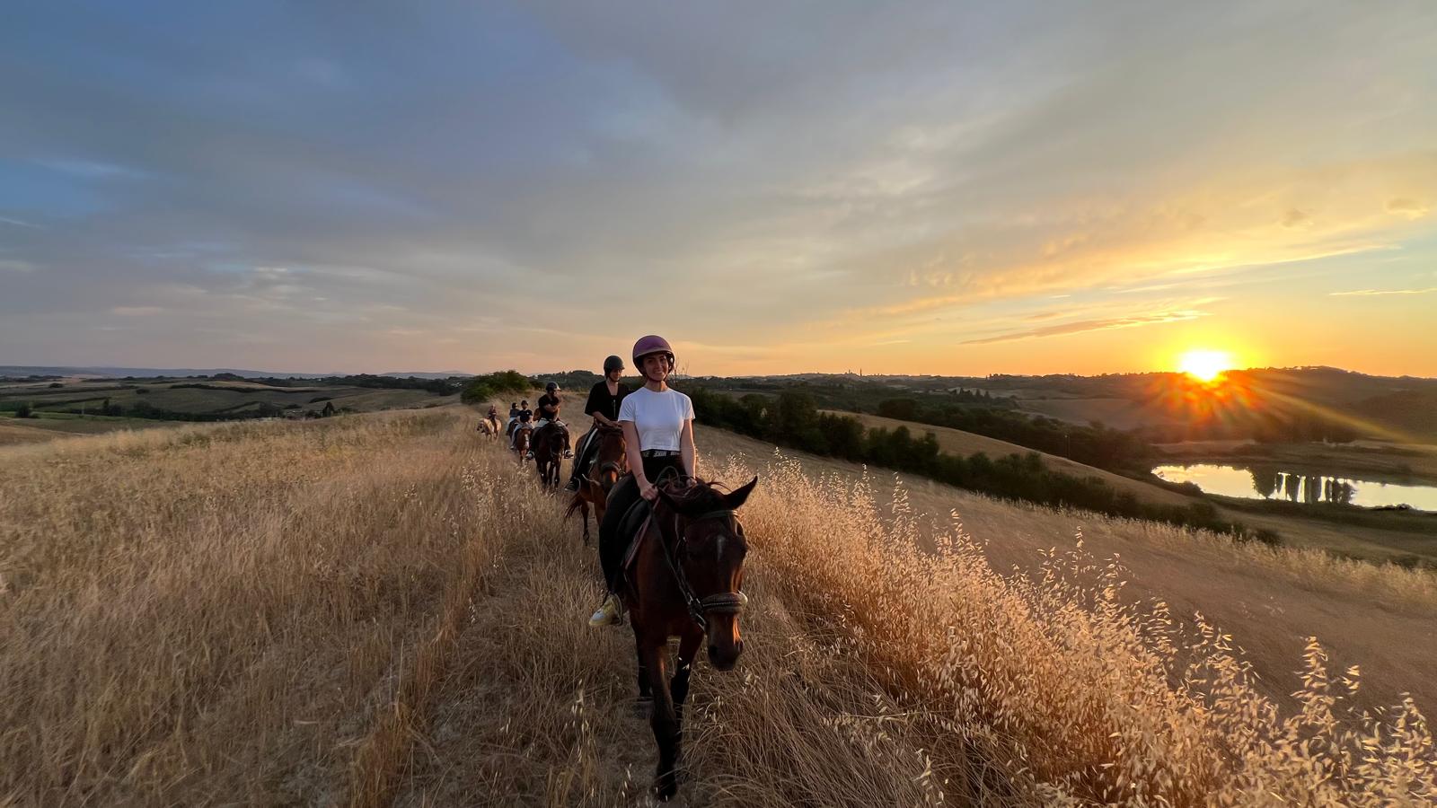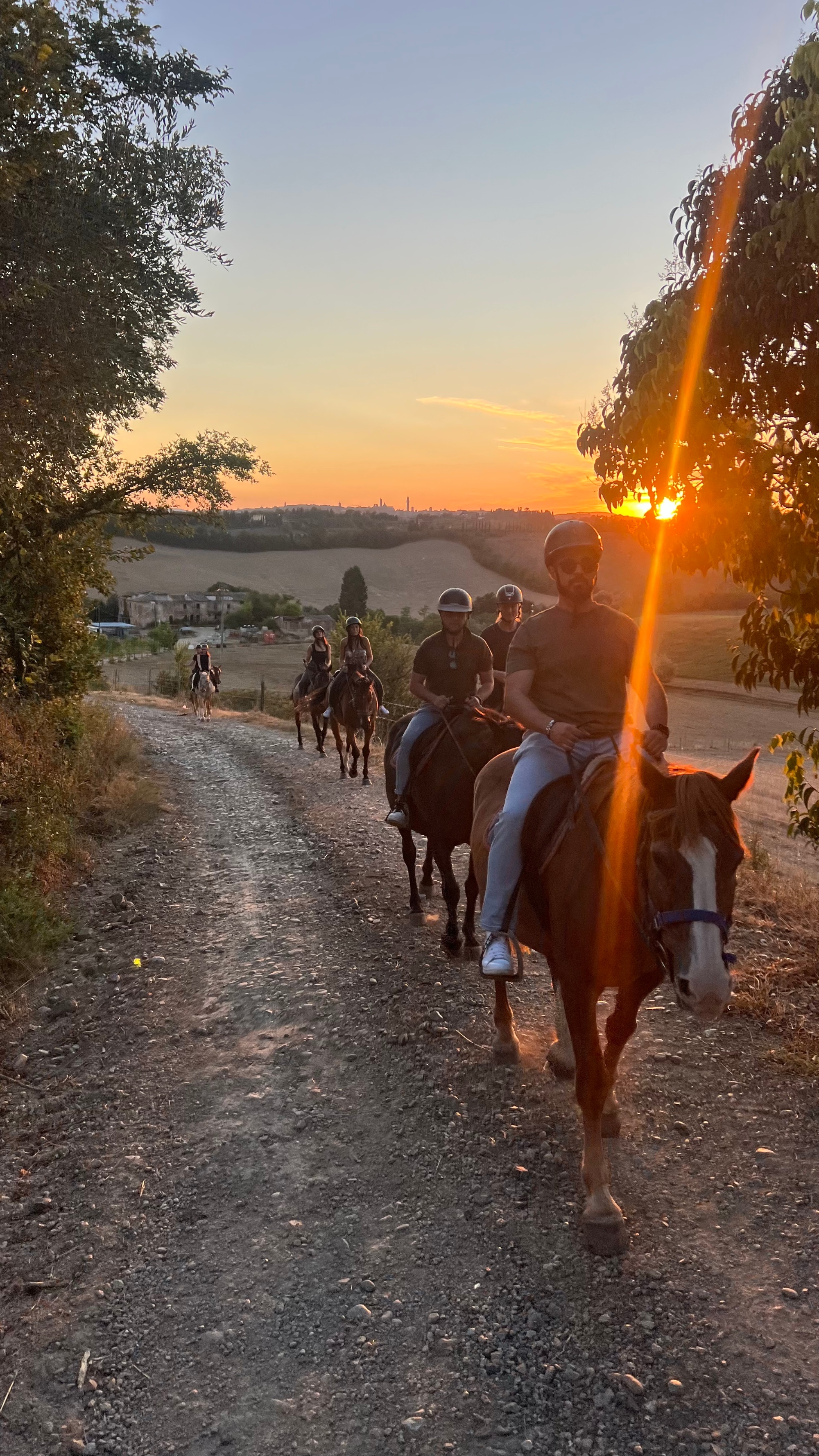 Una volta in sella, si parte tra dolci colline con Siena all’orizzonte, lungo sentieri sterrati e campi aperti, dove il tempo sembra rallentare. Il silenzio è rotto solo dal passo dei cavalli e dai suoni della natura. Lungo il percorso è possibile vedere cavalli e mucche pascolare liberi nei paddock, muoversi in branco e socializzare tra loro, in un ambiente pensato per rispettarli.