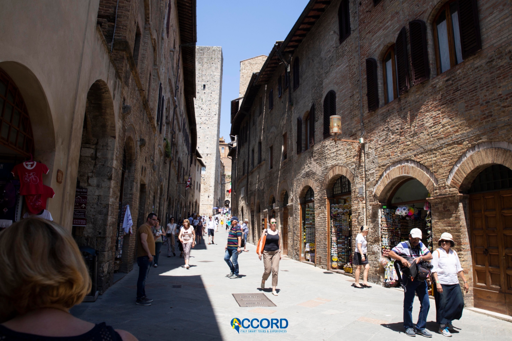 Inizieremo il tour da Firenze alle 8.30 e faremo la prima sosta per ammirare la città dal punto panoramico più famoso della città: Piazzale Michelangelo. Proseguiremo poi verso un’altra cittadina di eguale, seppur diversa, bellezza: San Gimignano. Avremo a disposizione circa un'ora per passeggiare e visitare il centro storico, famoso per le sue torri e le sue mura. Prima degustazione in Fattoria con Vini Chianti, Vernaccia e prodotti tipici.